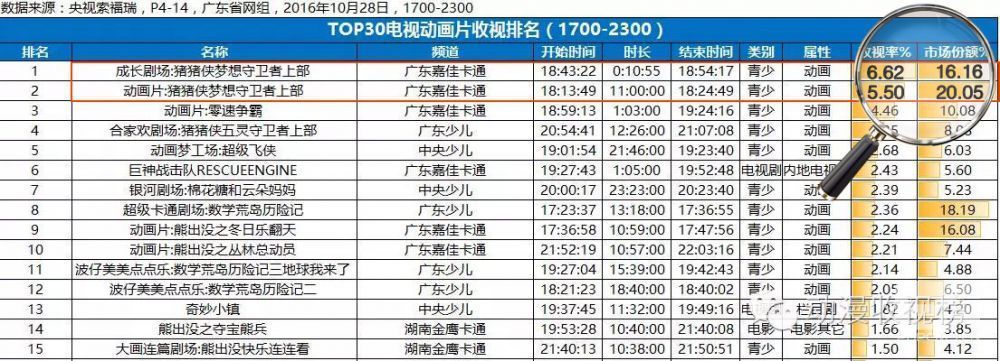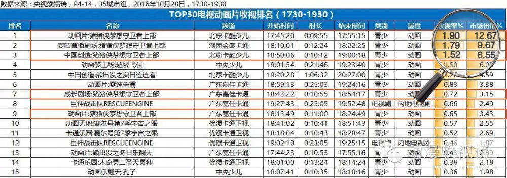在對(duì)10月28日至11月6日的動(dòng)畫收視率統(tǒng)計(jì)中,可以看到《豬豬俠之夢想守衛(wèi)者》保持著堅(jiān)不可摧的頭牌地位,10天的首播周期中,豬豬俠在金鷹、卡酷、嘉佳三大卡通衛(wèi)視的收視率有9次登陸全國收視榜首,讓業(yè)界側(cè)目。